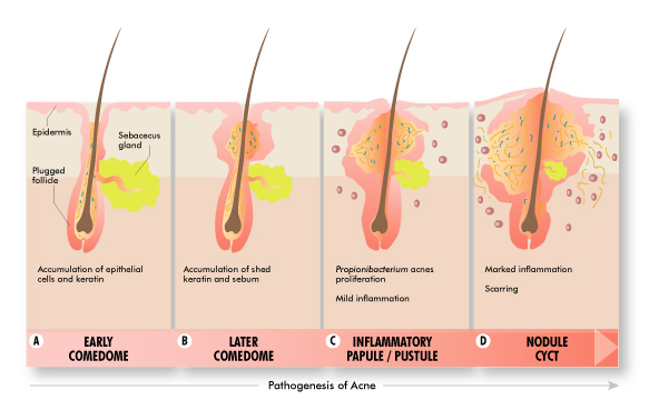 صورة توضح امتلاء الغدة الزيتية بافرازها وانسدادها بالخلايا الكيراتينية ومن ثم نمو البكتريا وانفجار الغدة والالتهاب الناتج عن كل هذا