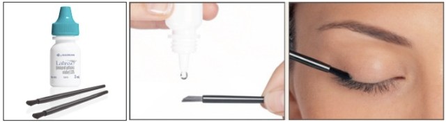 توضع نقطة واحدة من المحلول على الفرشاة ثم توضع على خط الرموش العلوي للعين عن جذور الرموش.